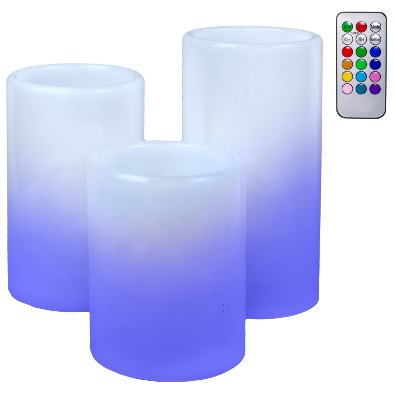 Комплект от 3 LED свещи с дистанционно управление и таймер! Можете да избирате между 12 различни цвята, за да създадете подходящата атмосфера във вашия дом или офис.
