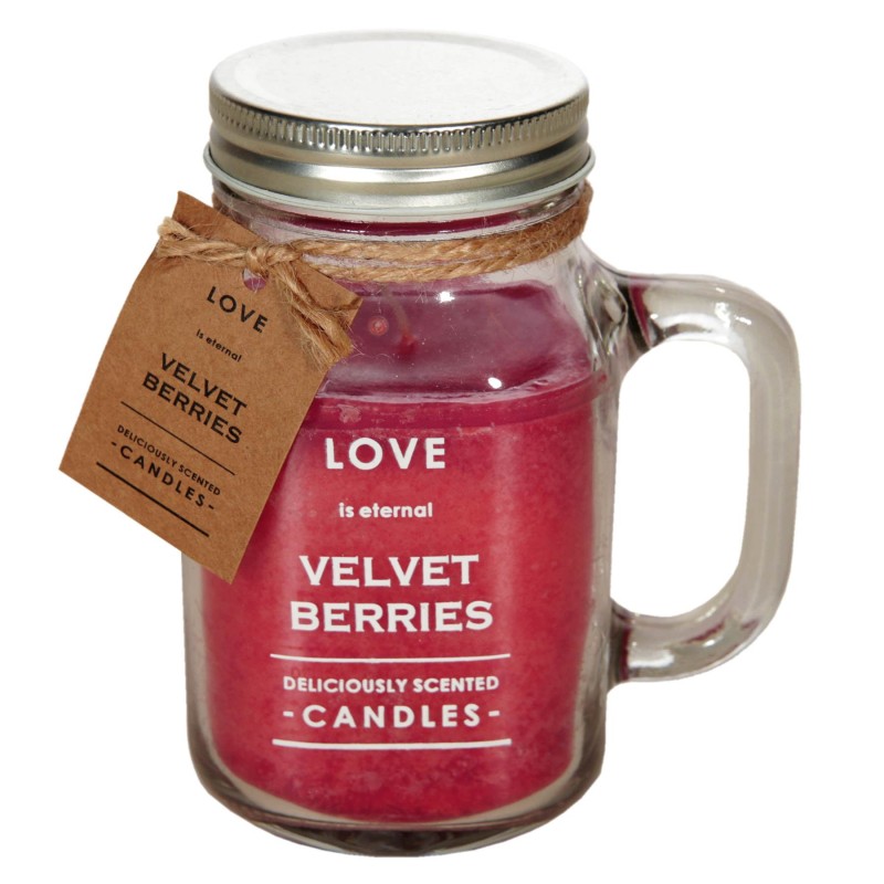 Ароматна свещ с аромат на къпини в стъклен буркан с дръжка и капак.