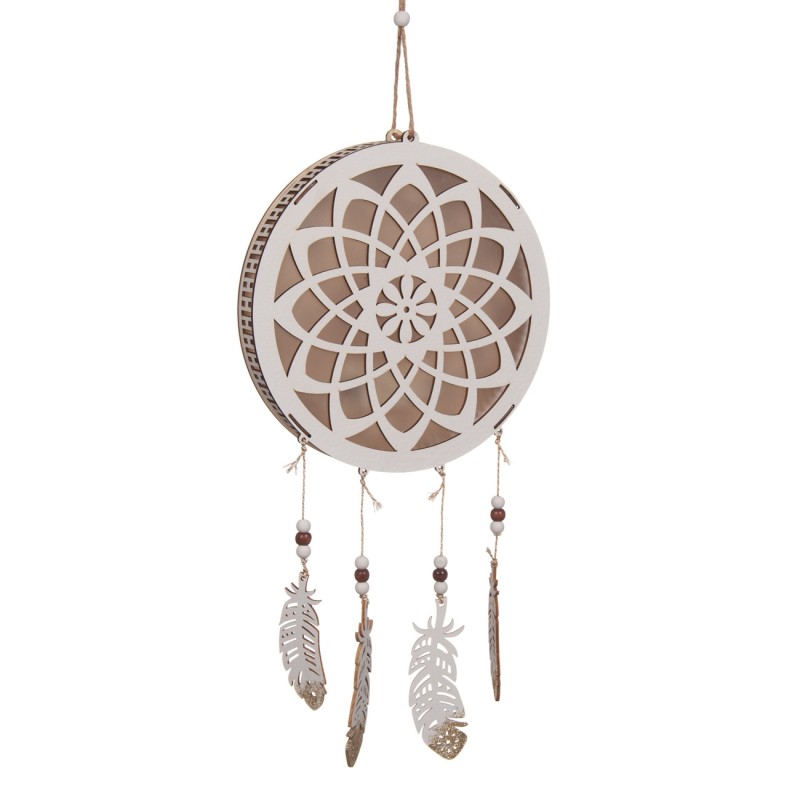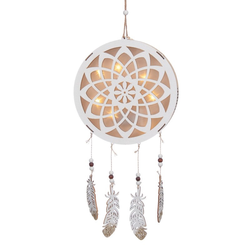 Светеща декорация във формата на индианския талисман Ловец на сънища, изработен от дърво в естествен цвят със 7 LED лампички и дървени пера със златист брокат.
