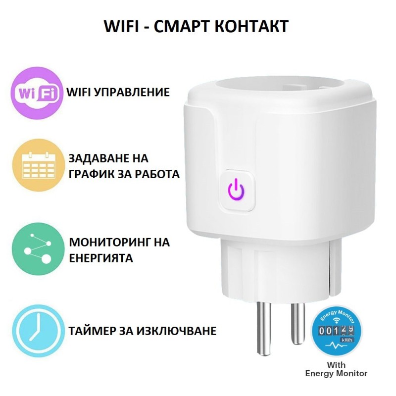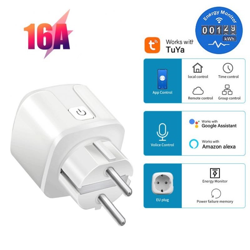Смарт wi-fi контакт 16A Tuya Smart, Smart Life, с таймер и електромер. Преходника за контакт работи с Alexa Google Home TuyaSmart Smart Life. Дистанционно управление чрез приложението.