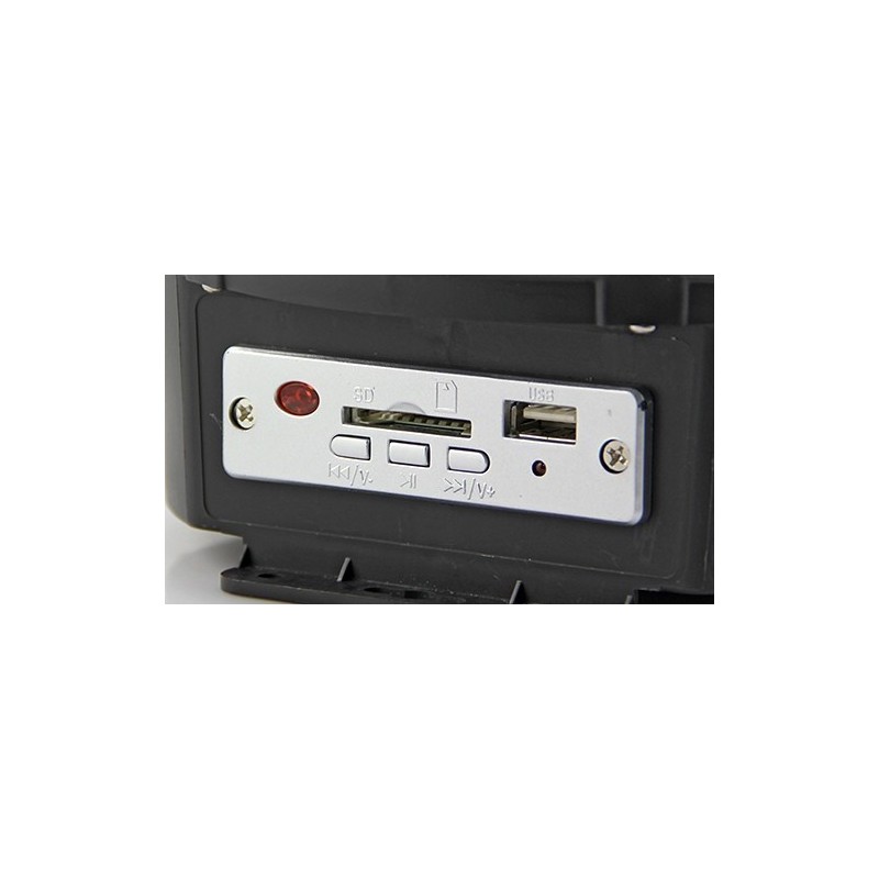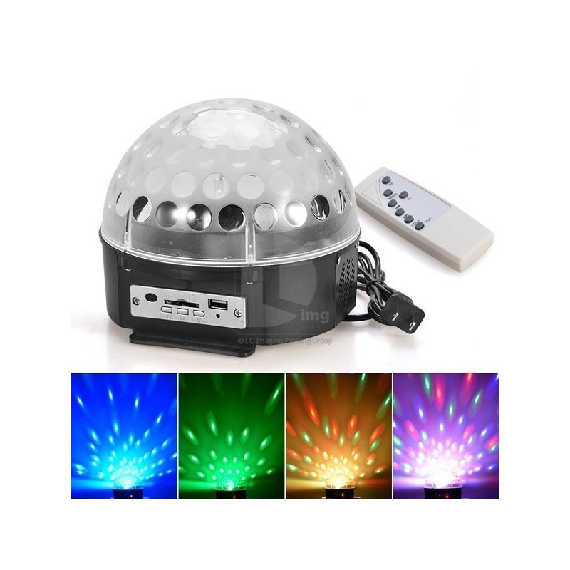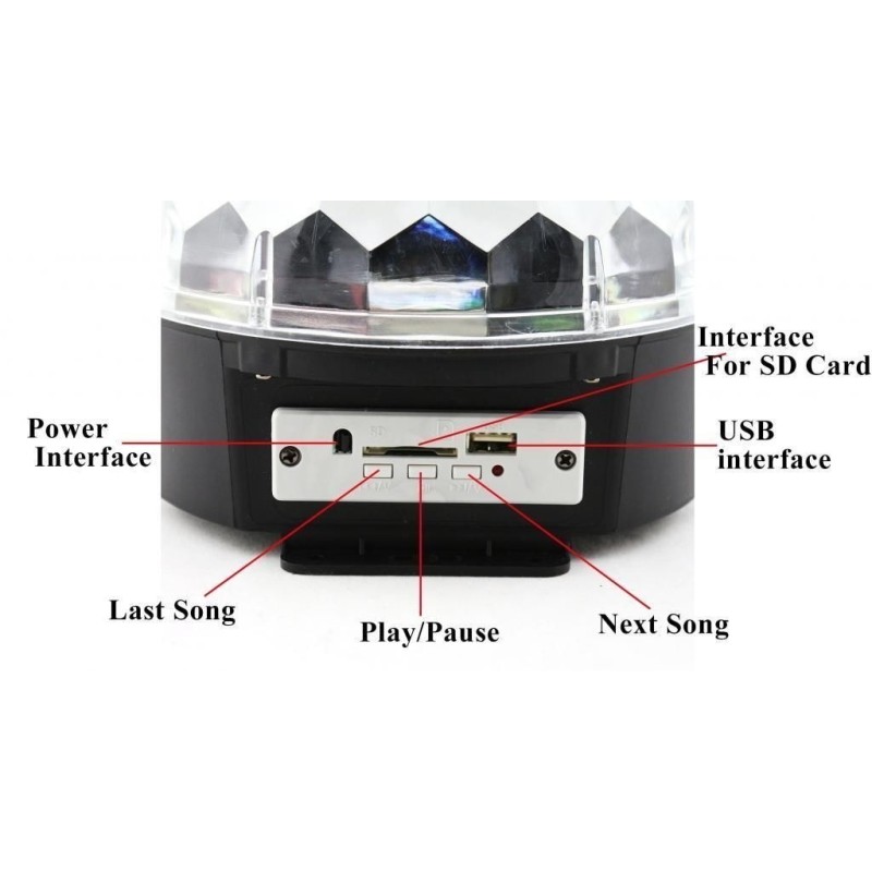 Тази LED лампа разполага с множество функции и възможности. Има слот за micro SD и MMC карти, както и за флаш памет. Можете да включите вашата любима музика, като я поставите на карта памет или флаш памет. Лампата е снабдена с две мощни енергоспестяващи колони, които осигуряват качествен звук. Има и звуков контрол на ефектите, за по-голямо удобство.