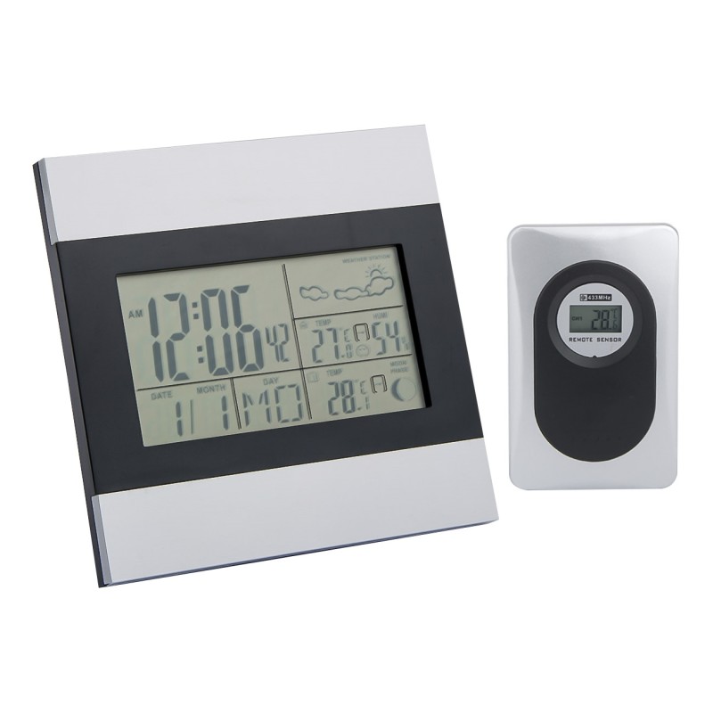 С електронен дисплей, показващ дата, месец, ден от седмицата, индикатор за вътрешна температура и влажност, външна температура и влажност, часовник с функция аларма, индикатор за ниска мощност и показател за фазата на луната.