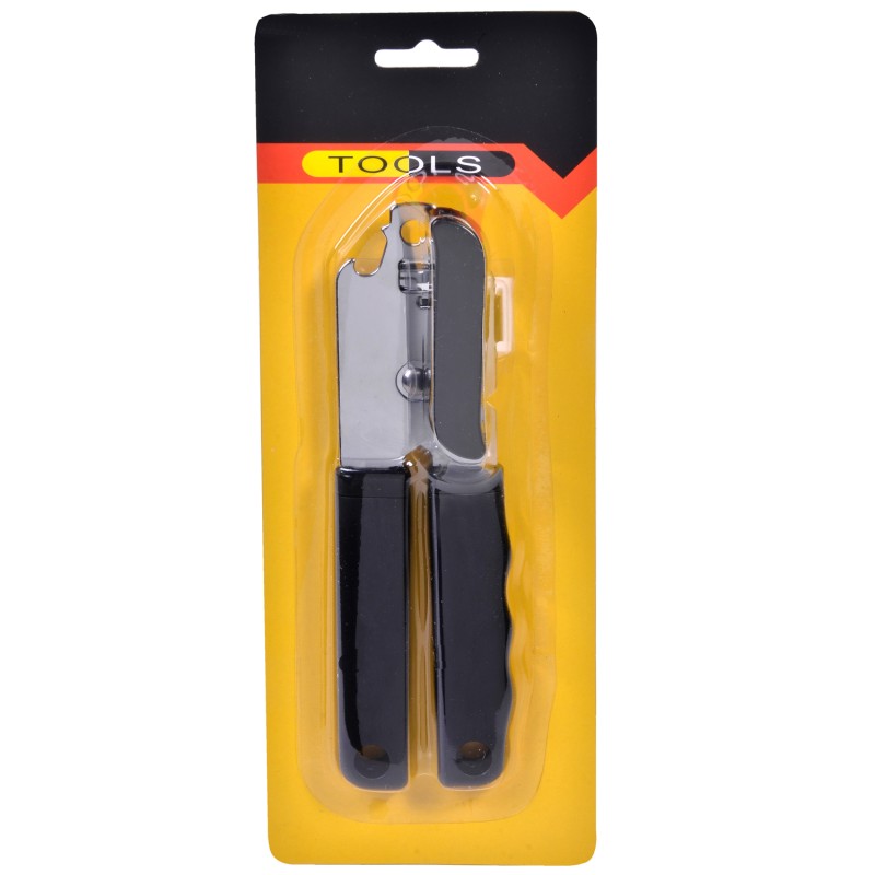 Първокласна отварачка за консерви, изработена от висококачествена неръждаема стомана с пластмасови дръжки и ключ, необходими за управление на захващането.