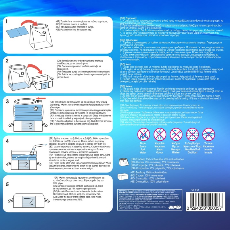 Инструкции за употреба: Поставете дъното в торбата. Поставете правилно торбата в калъфа за съхранение. Поставете юрганите и възглавниците във вакуумната торба. Затворете добре клипса и се уверете, че не изпуска въздух. Махнете капачката и развийте вентила. Сложете маркуча на прахосмукачката в клапана и издърпайте въздуха. Когато приключите, завийте клапана и поставете капачката. Затворете ципа на калъфа за съхранение. Вече сте икономисали до 75% повече пространство.