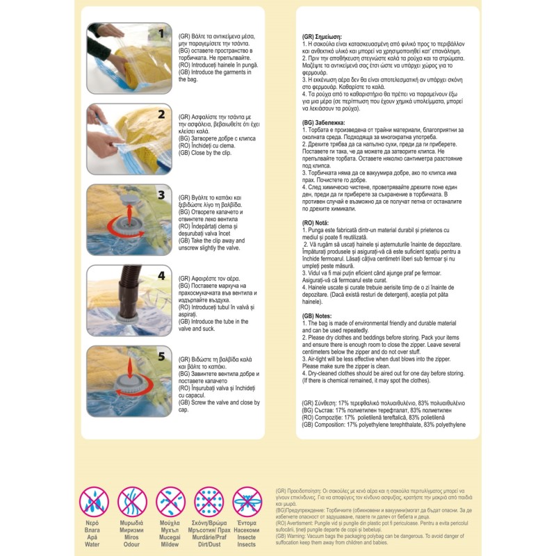 Инструкции за употреба: Подредете дрехите в торбичката като оставите място и не препълвате. Затворете добре с клипса. Отворете капачето и отвинтете леко вентила. Поставете маркуча на прахосмукачката във вентила и издърпайте въздуха. Завинтете вентила добре и поставете капачето.