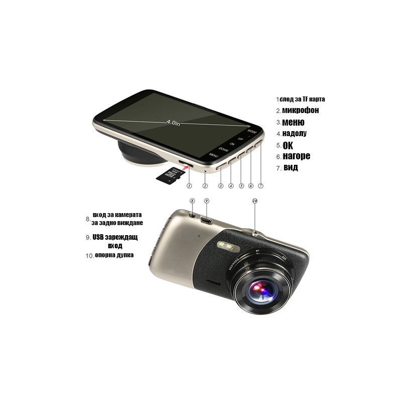 Видео разделителна способност: Отпред: 1080P 1920x1080 (30FPS); Задна: VGA 720x480 (25FPS)