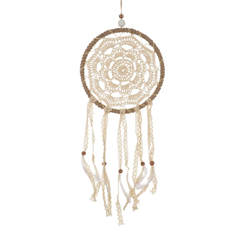 Висяща декорация във формата на индианския талисман Ловец на сънища в бежов цвят с дантелени ресни.