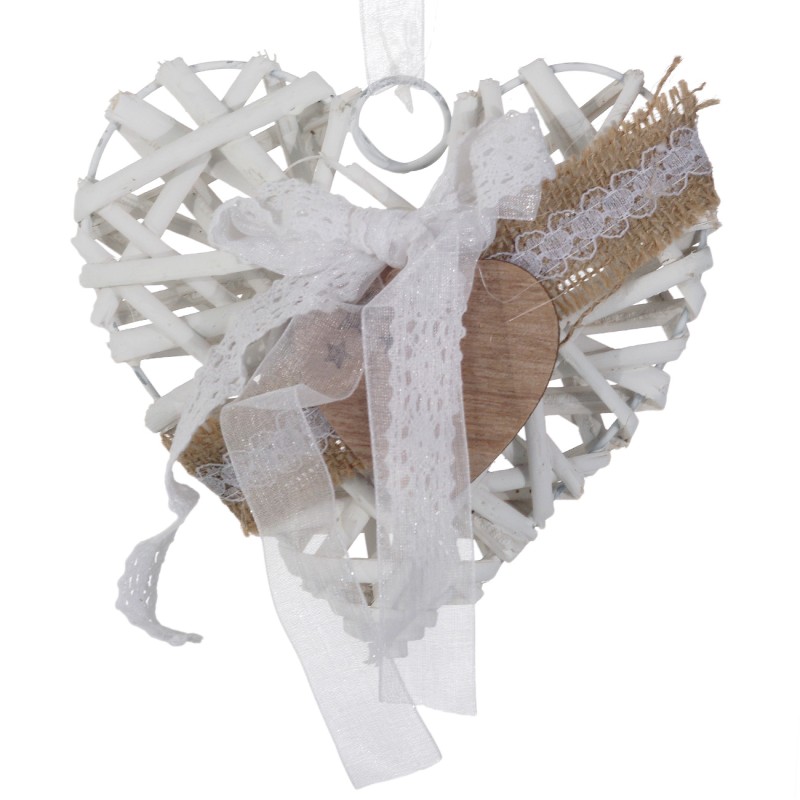 Висящо декоративно сърце, изработено от дърво и дантела в бял цвят.