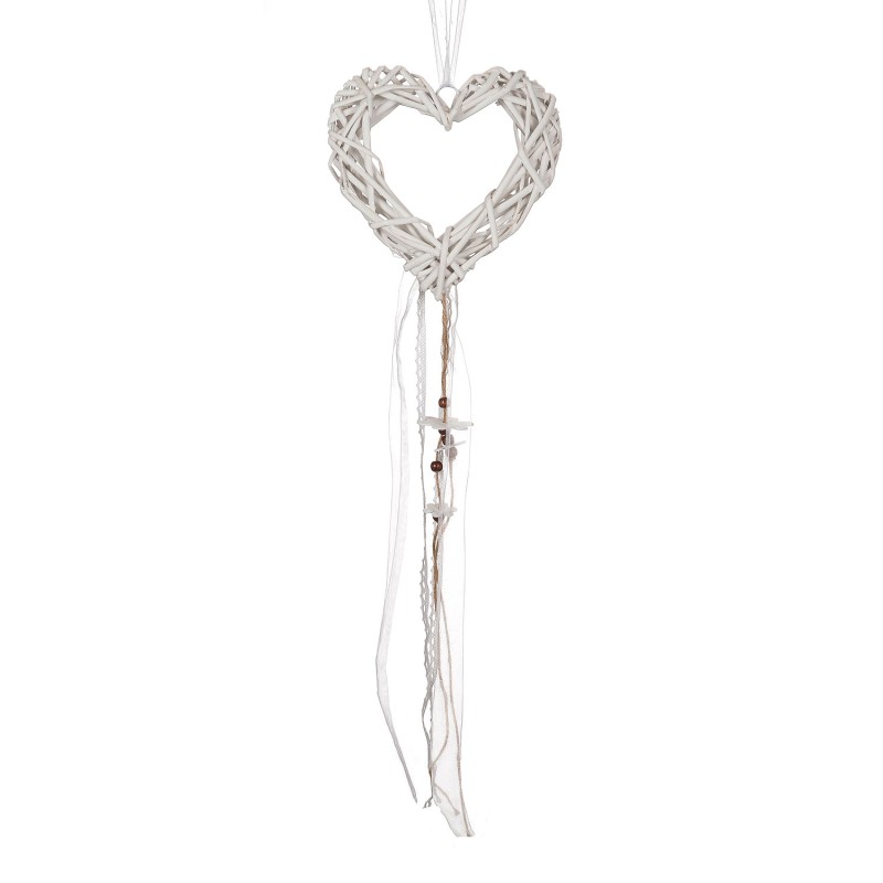 Висяща декорация, изработена от дърво във формата на плетено сърце в бял цвят с дантелени ресни и мъниста.