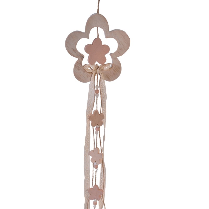 Висяща декорация, изработена от дърво в естествен цвят във формата на цвете с дантелени ресни и малки дървени цветенца.