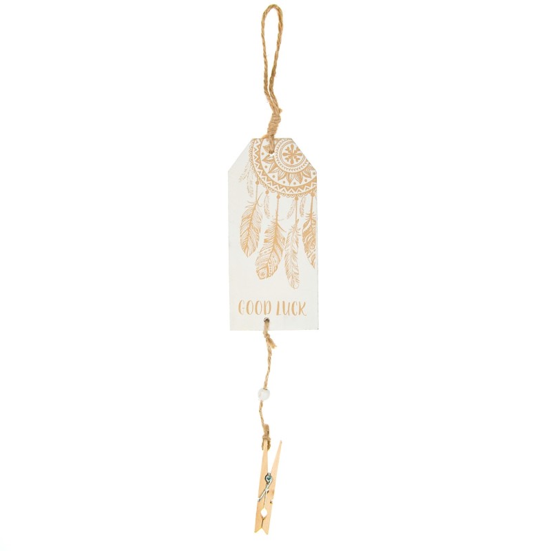 Висяща декорация, изработена от дърво с картинка на индианския амулет Ловец на сънища и дървена щипка.