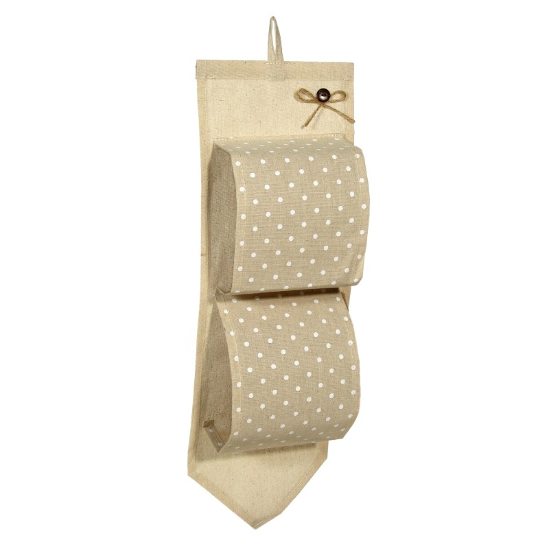 Практичен висящ органайзер с два джоба за съхранение на тоалетна хартия, изработен от полиестер и лен в светло кафяв цвят с бели точки.