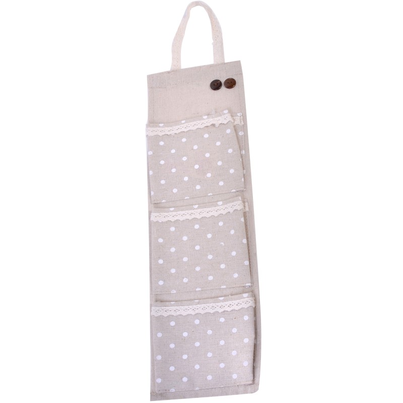Практичен висящ органайзер с три джоба за съхранение на кухненски прибори и принадлежности, изработен от полиестер и лен в бежов цвят с бели точки.