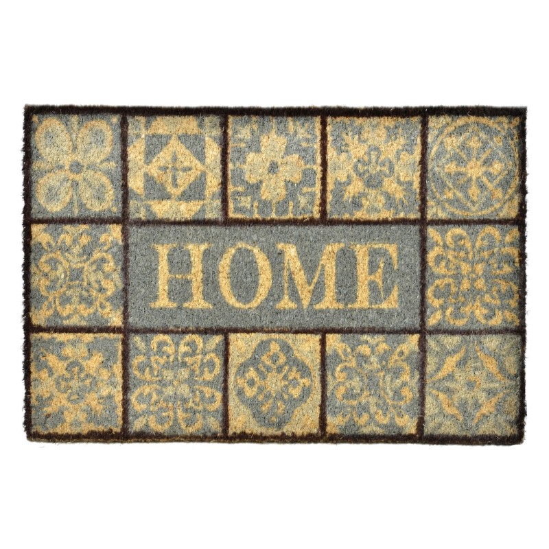 Входна изтривалка в сив цвят с надпис WELCOME и красиви орнаменти, изработена от PVC и кокосови влакна.