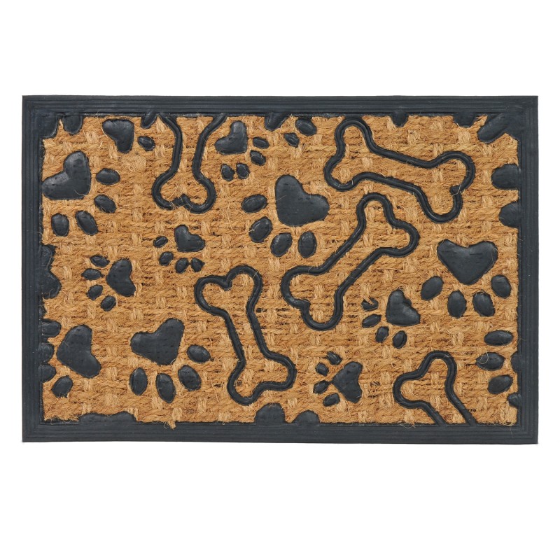 Входна изтривалка в светло кафяв цвят с принт на кучешки стъпки и кокали, изработена от PVC и кокосови влакна.