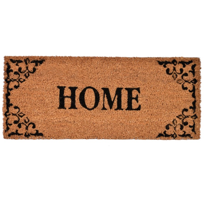 Входна изтривалка в светло кафяв цвят с надпис HOME и стилизирани орнаменти, изработена от PVC и кокосови влакна.