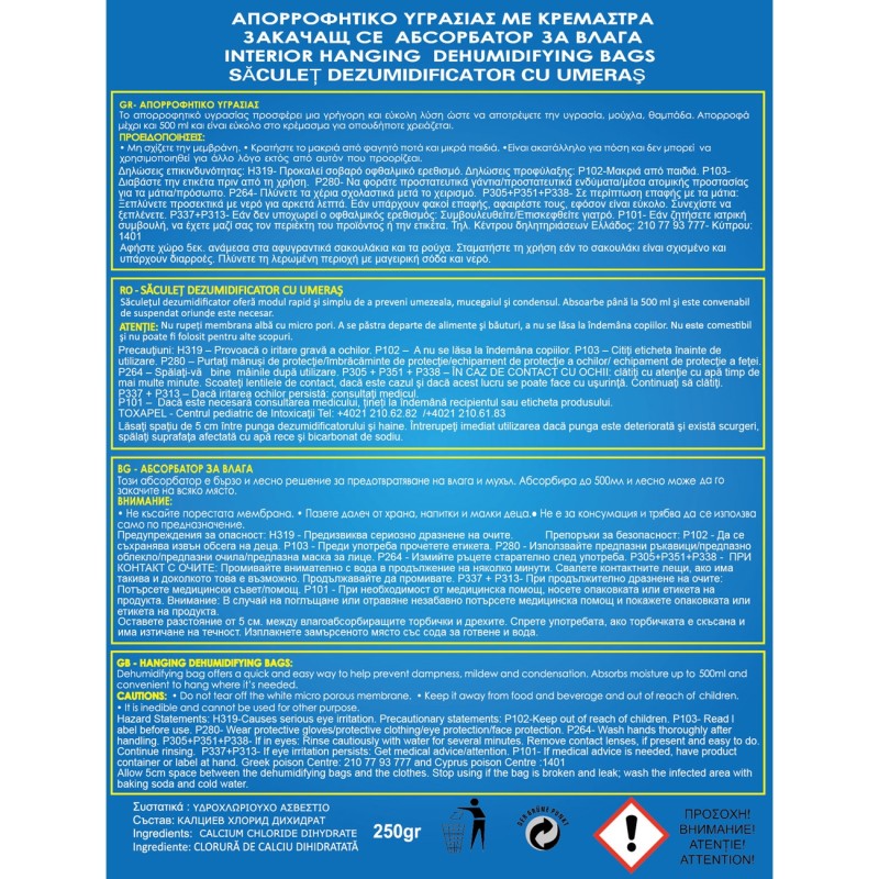 Абсорбаторът разполага с практична закачалка и е идеален за помощения, които не се проветряват редовно като мазета, стаи, санитарни помещения, килери, кухни или други помещения подложени на концентрация на влага.