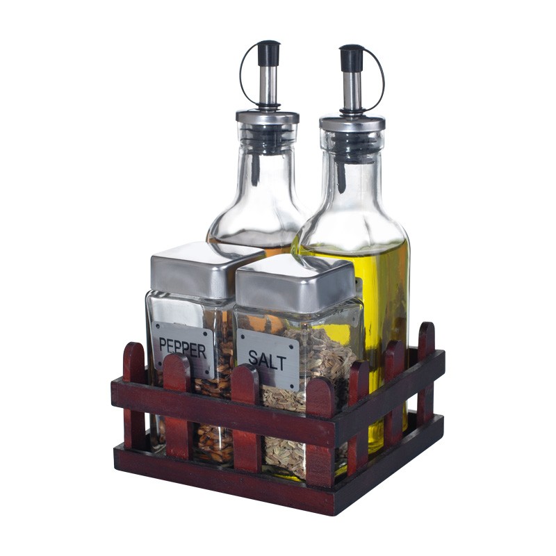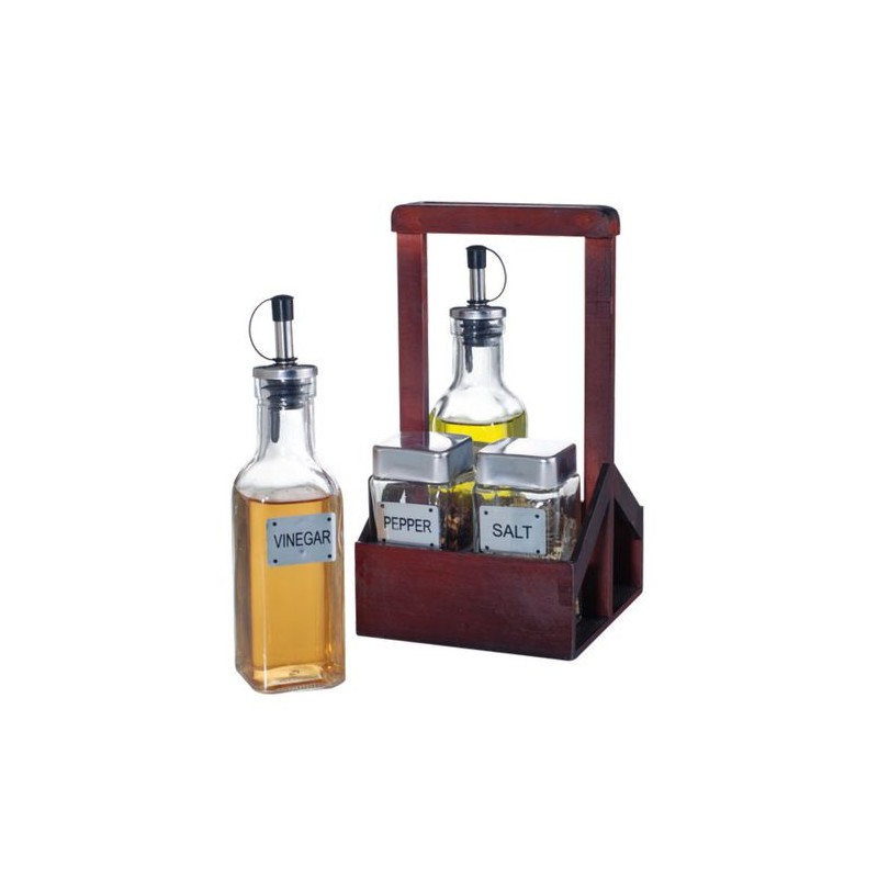 Стилен оиверник със стъклени бутилки и солнички поставени в дървена поставка.