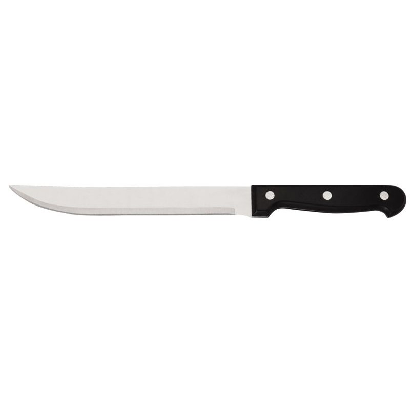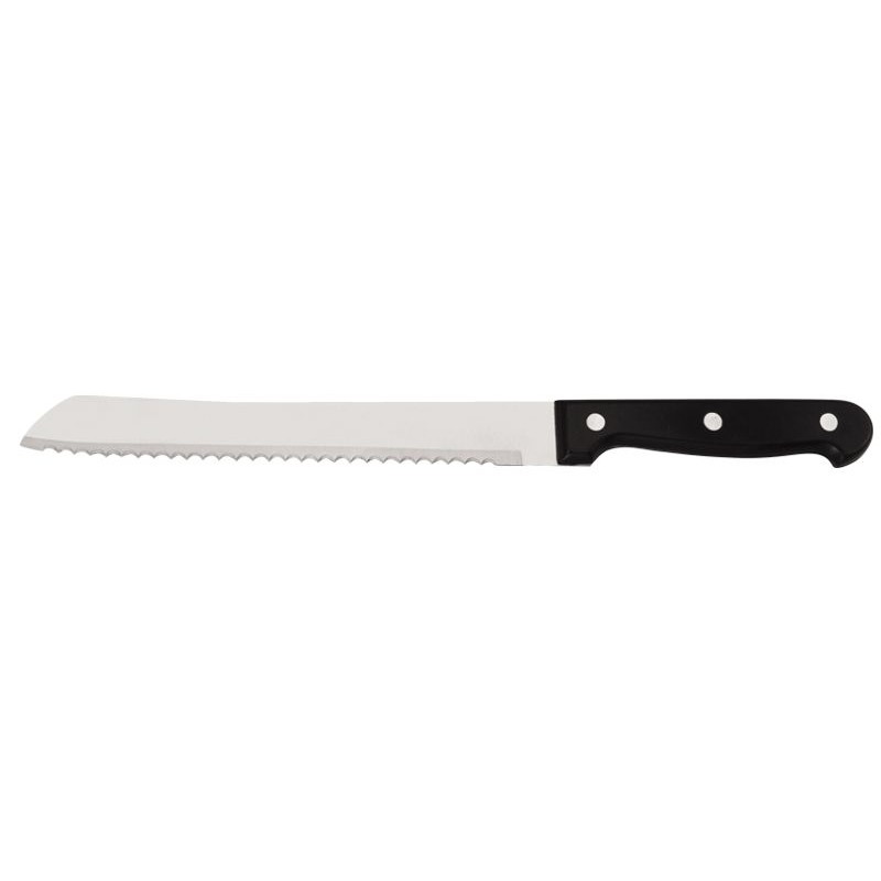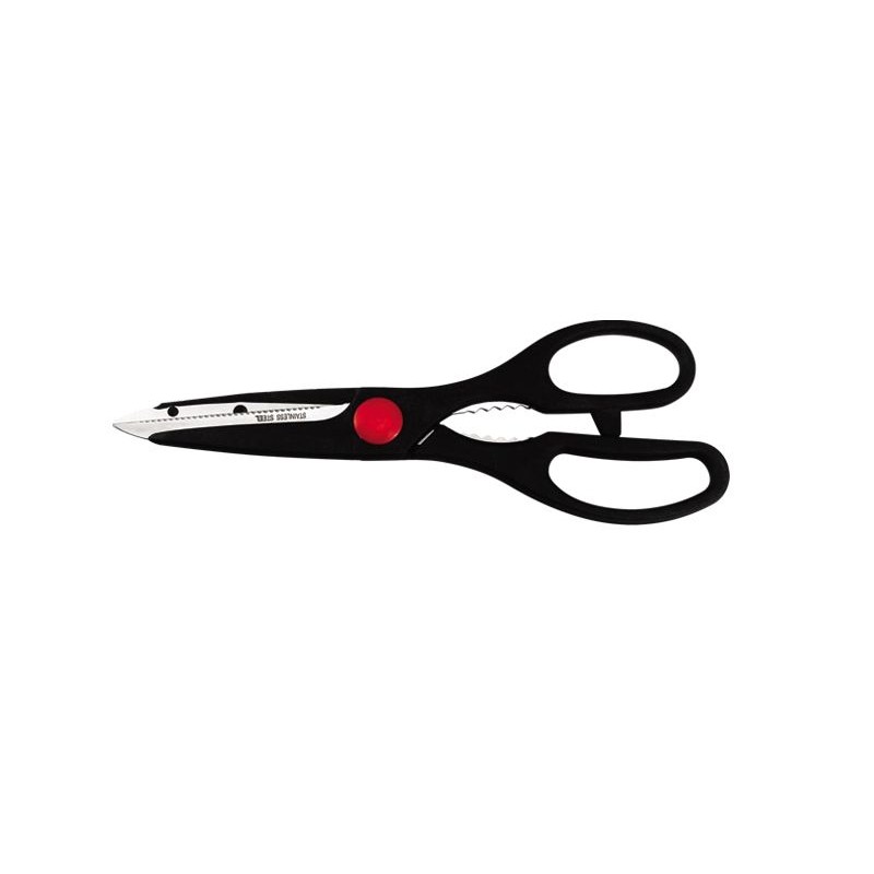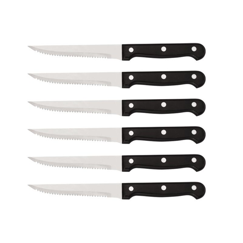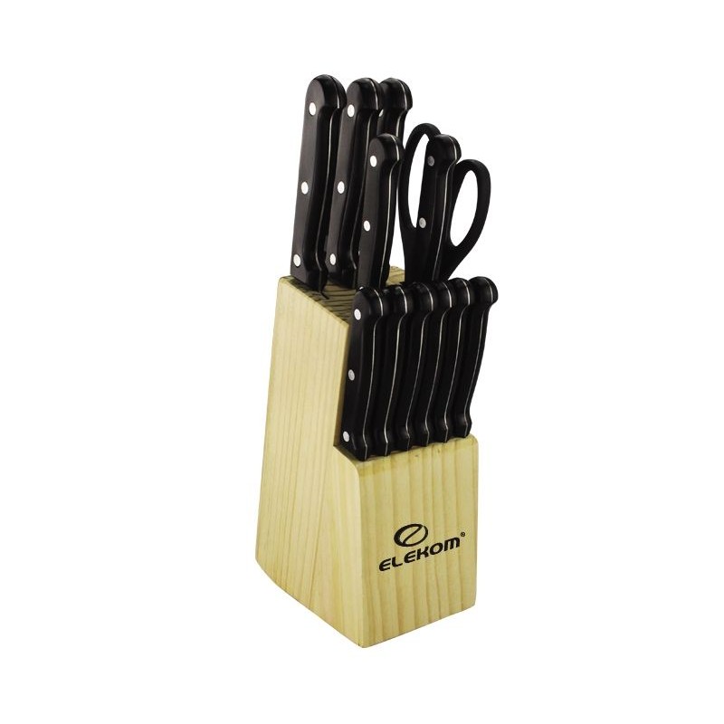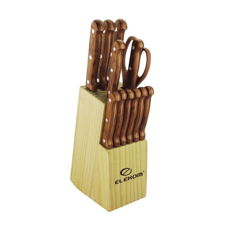 Кухненски комплект ножове и ножица в масивна вървена поставка. Остриетата са изработени от висококачествена неръждаема стомана, а дръжките от дърво.