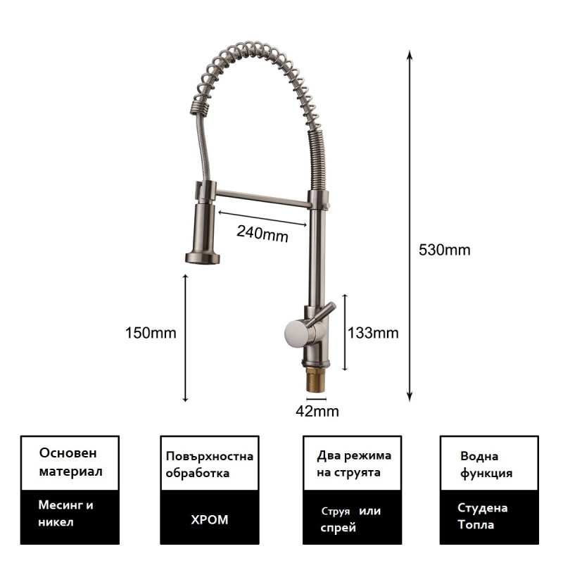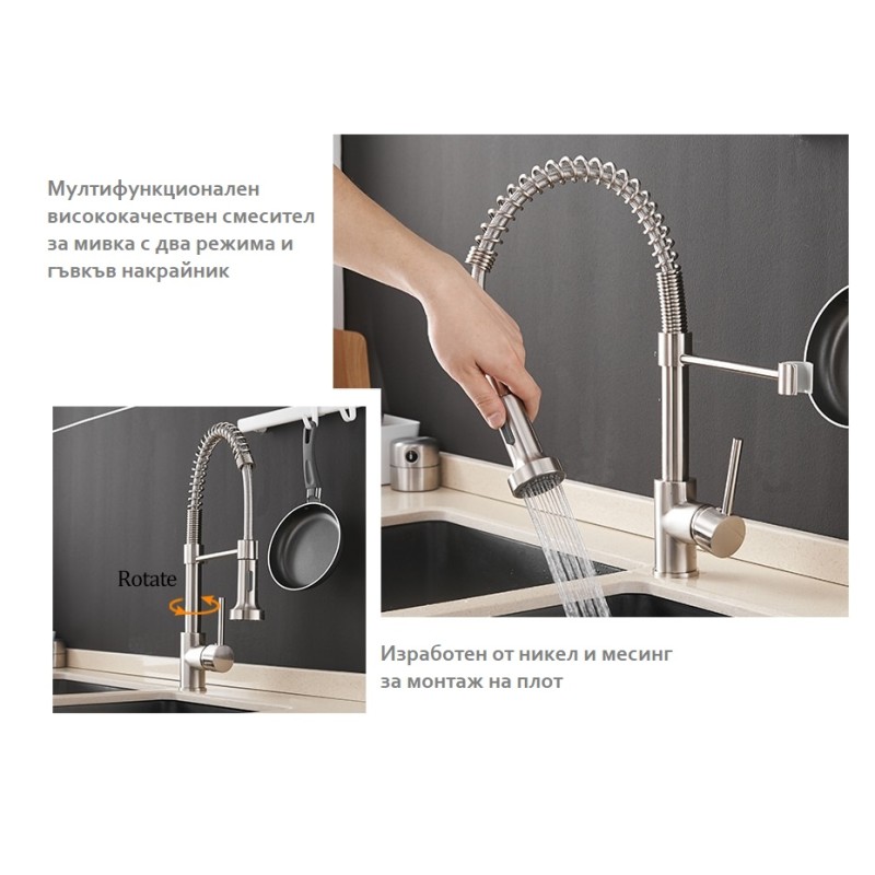 Висококачествена изработка от месинг и никел. Многофункционален и стилен дизайн с хромирано покритие, пасващ идеално на интериора на кухнята.