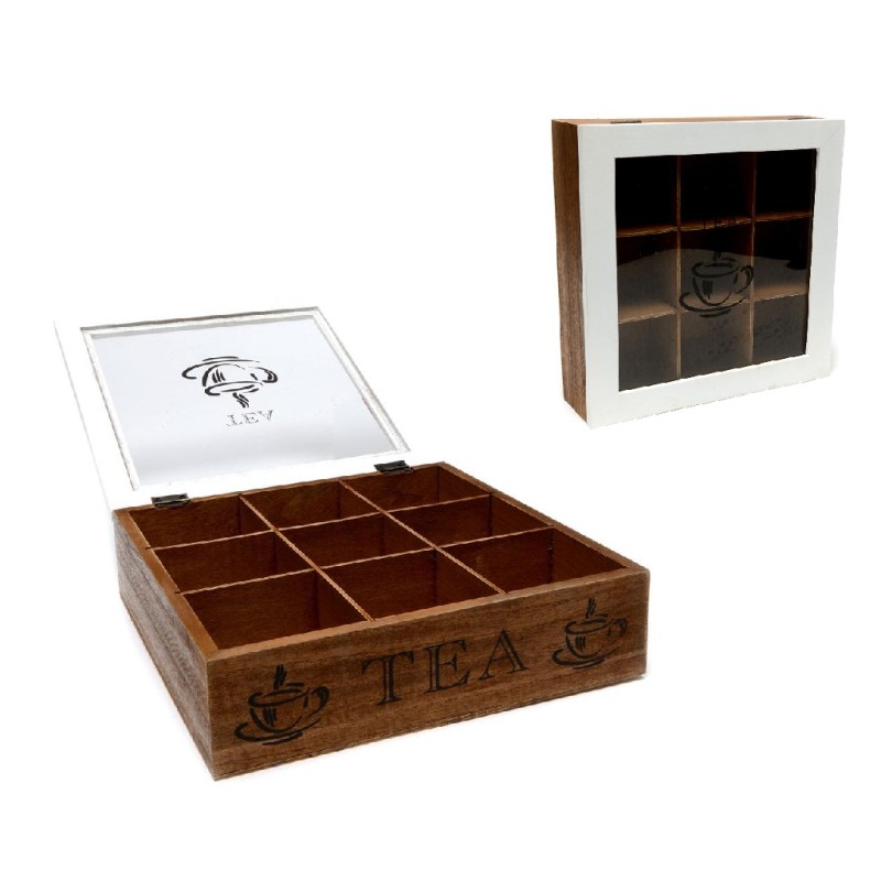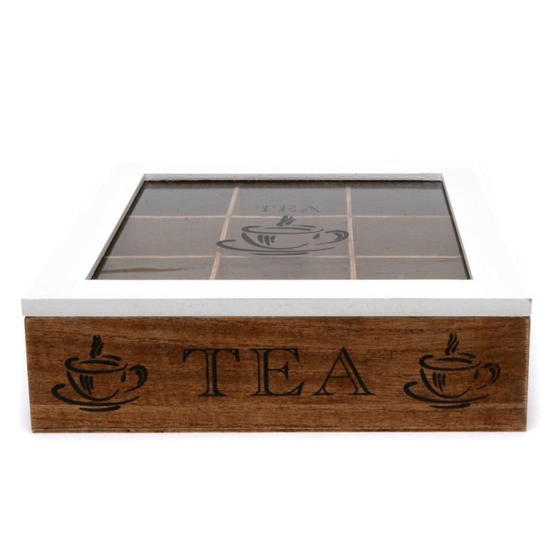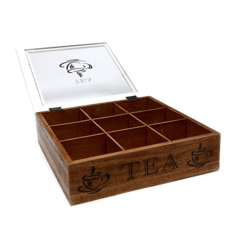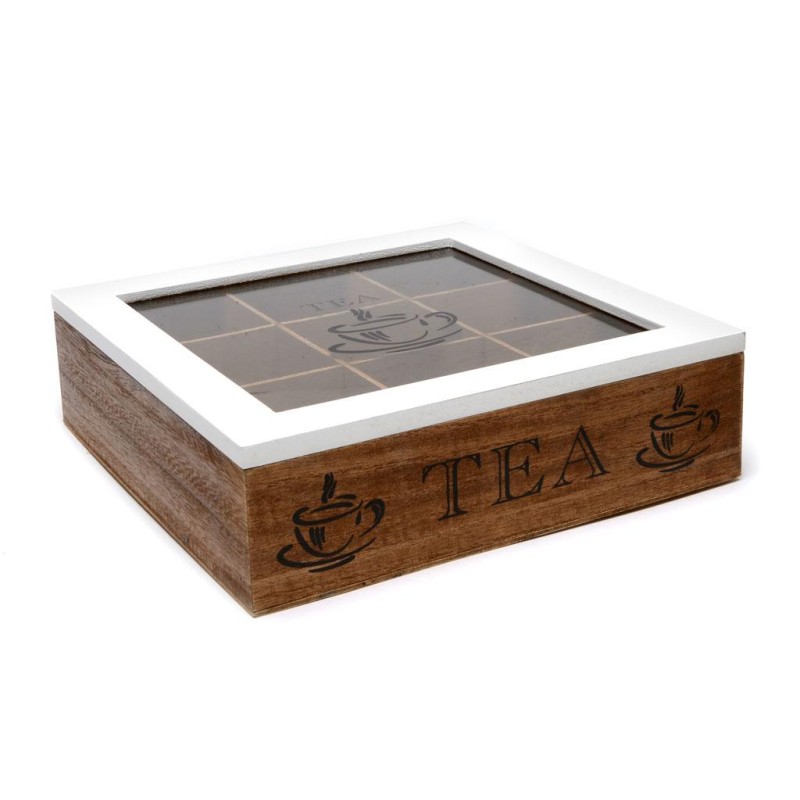 Кутия асорти за съхранение на чай и кафе с 9 отделения и стъклен капак. Страхотно допълнение за ценителите на топли напитки.