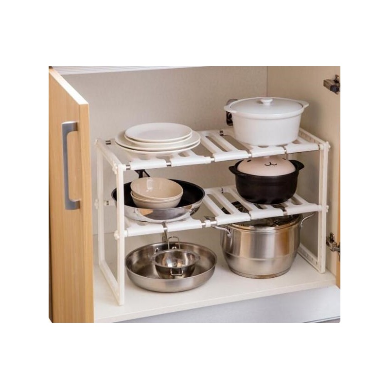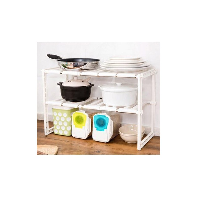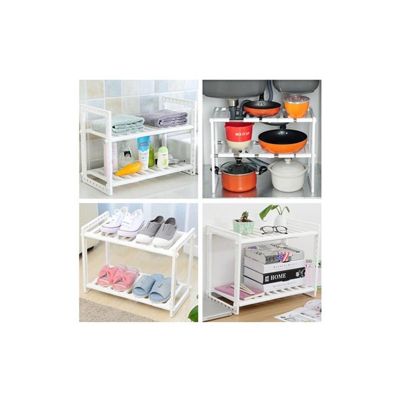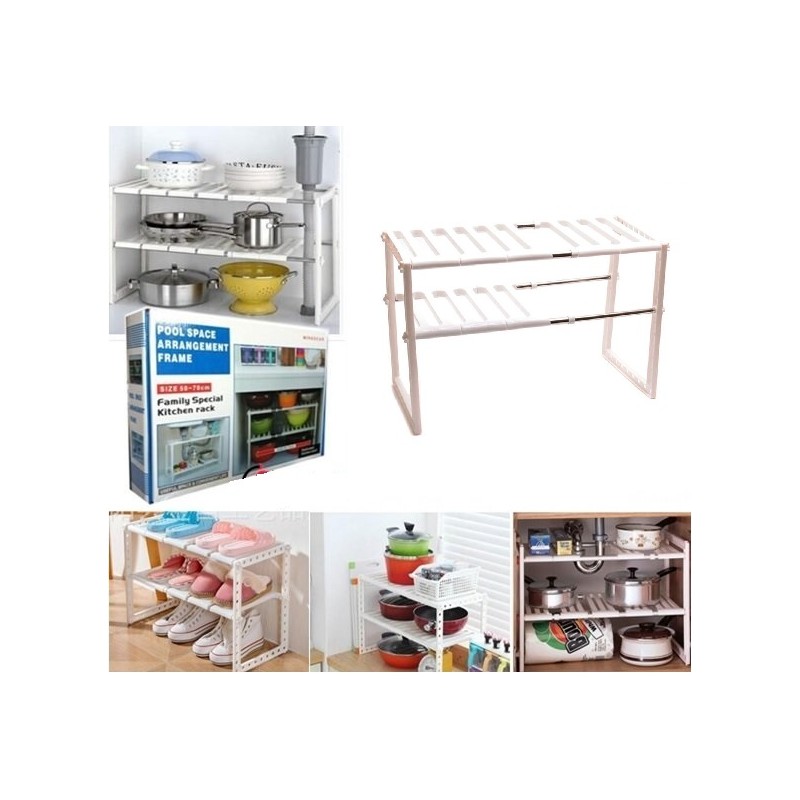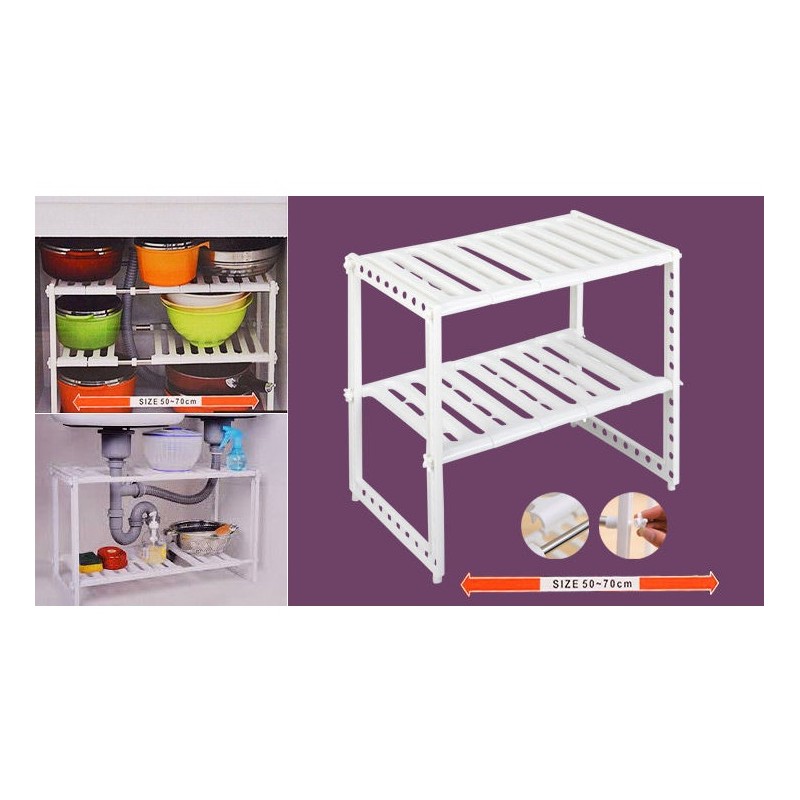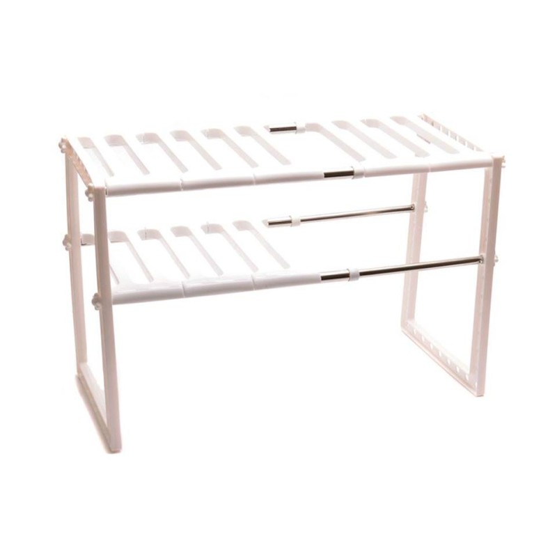 Удобен домакински стелаж с регулируема дължина от 50 до 70 см и височина до 38см. Предназначен за подреждане на домашни потреби, препарати, съдове, обувки и дори цветя. Той ще бъде вашият любим домакински органайзер.