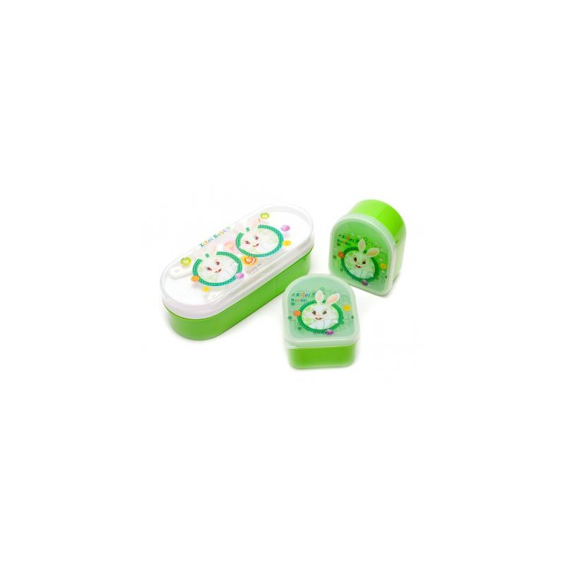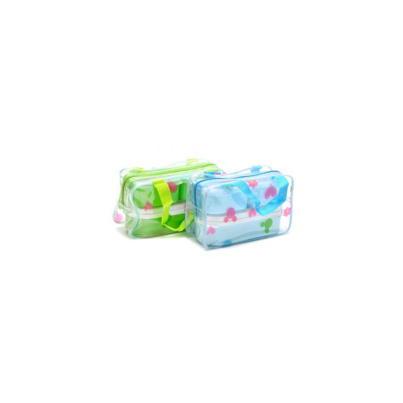 Комплект от 3 броя детски кутии с капаци и прибори за хранене компактно съхранени в непромукаема чанта с дръжки.
