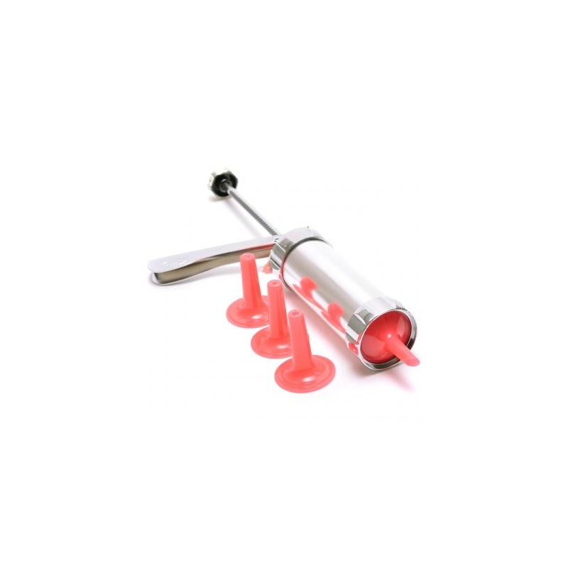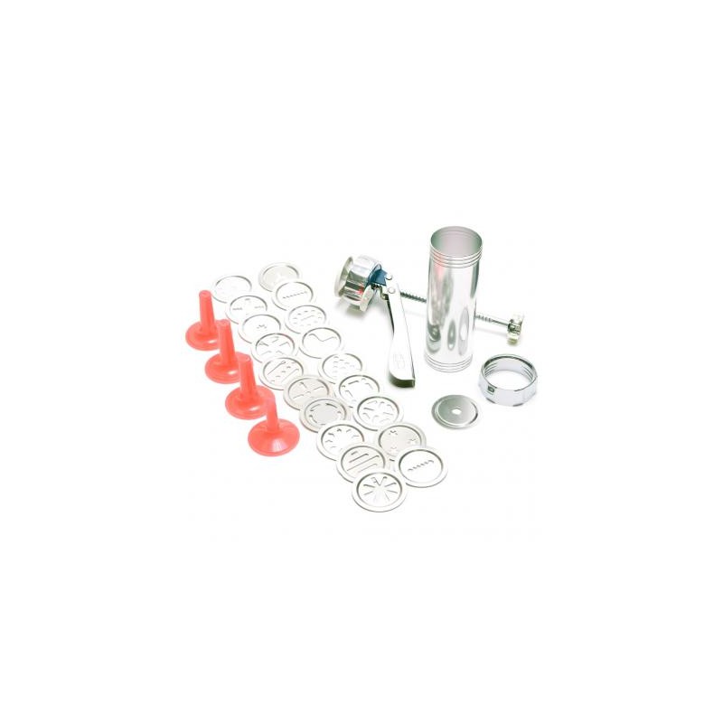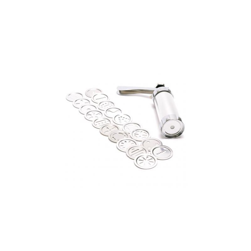Метален шприц за сладки и бисквити с 4 накрайника и 10 форми. Предлага се в кутия.