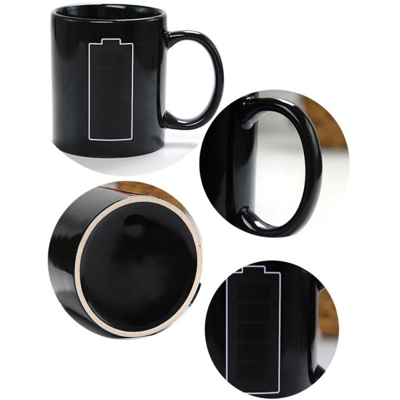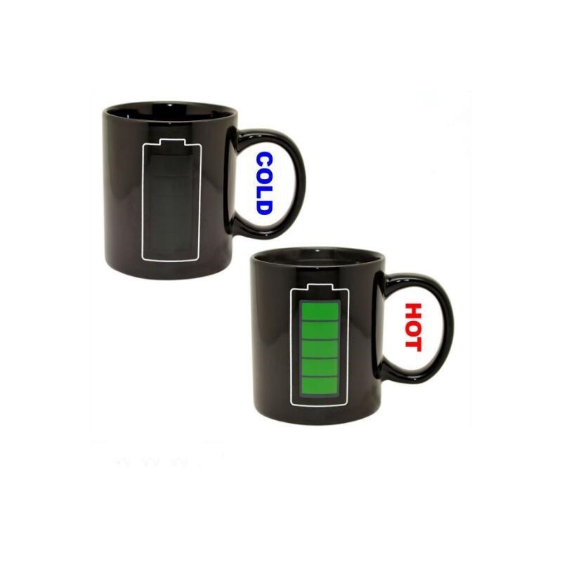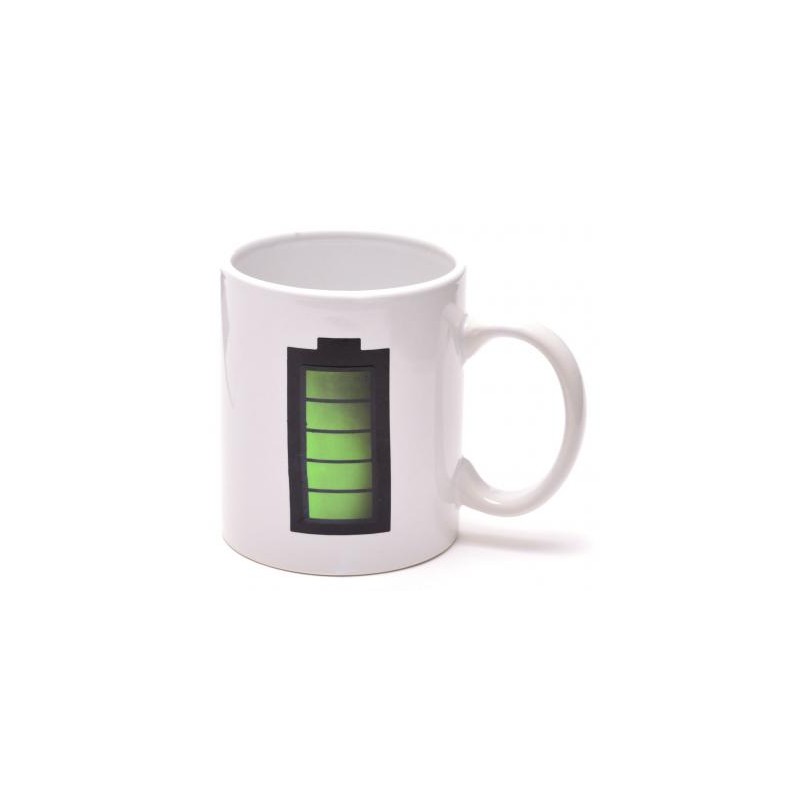 Сутрин имате нуджда да заредите батериите и обикновено това се случва с топла чаша кафе или чай. Тази чаша ще Ви покаже, че батериите са заредени веднага щом изсипите топла напитка в нея. Има изобразена празна батерия, когато чашата е студена, но щом изсипите топла напитка тя се оцветява в зелено. Готови сте да се заредите с енергия.