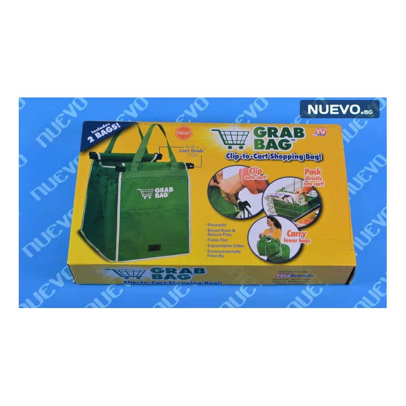 Сложете край на досадното и мъчително пазаруване с малки и неиздръжливи торбички. Представяме на Вашето внимание Grab Bag - полиетиленова чанта за многократна употреба, която с лекота се захваща за стените на всяка количка за пазаруване.