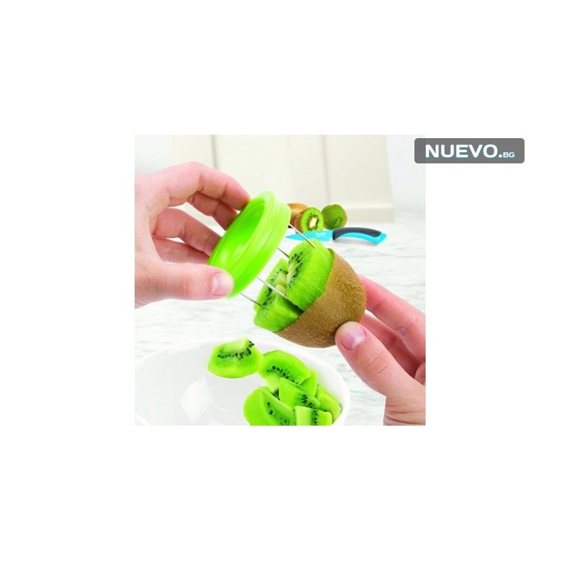Едно напълно ново и изключително лесно решение за белене и рязане не киви. Без усилия едновременно белете и нарязвате плода. За дасе насладите на плода винаги когато пожелаете,изберете бързия и практичен начин. -безвреденПродукт -идеален за белене и рязане на киви и други подобни плодове -материал- пластмаса -размери: 5 х 5 х 8см