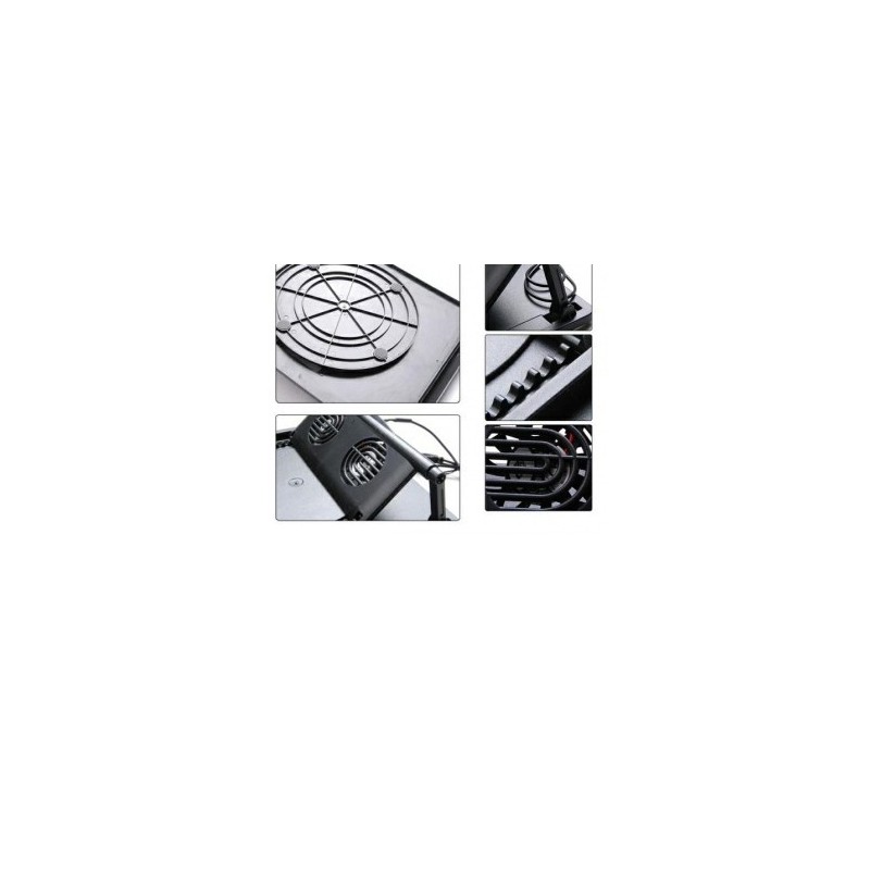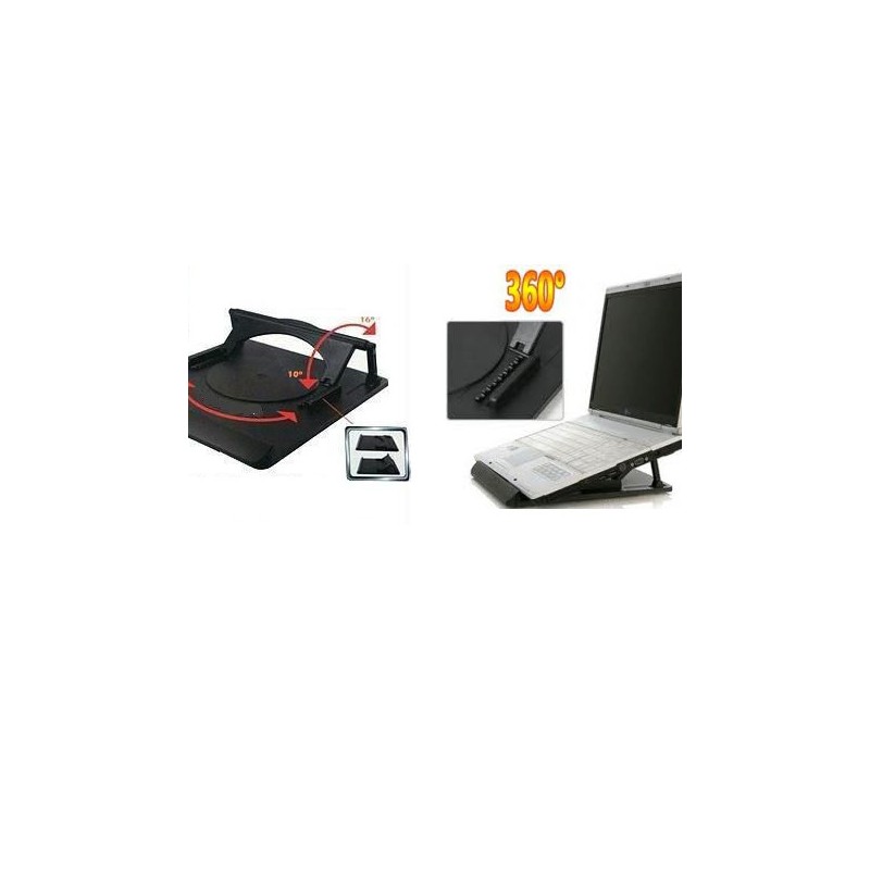 Тънка и лека поставка за Notebook с отлично охлаждаща компютърната система от два USB вентилатора, 7 позиции за регулиране на ъгъла и 360 градусов въртящ се плот.