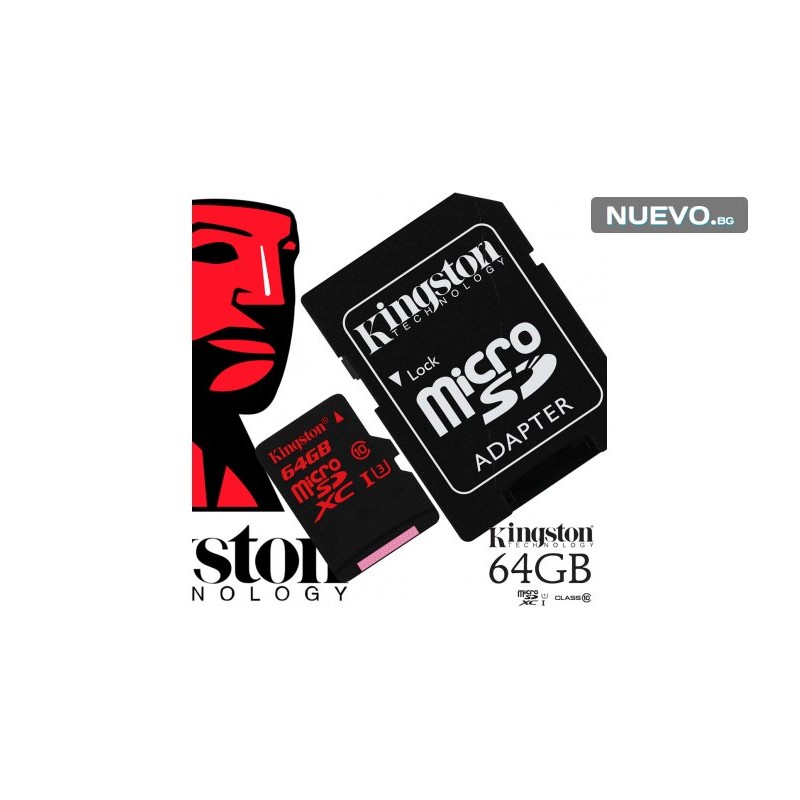 НУЕВО ти предлага супер промо на голяма карта micro SD KINGSTON 64 GB в комплект със SD преходник, който създава удобство за сваляне на информацията и за ползване в професионални камери.
