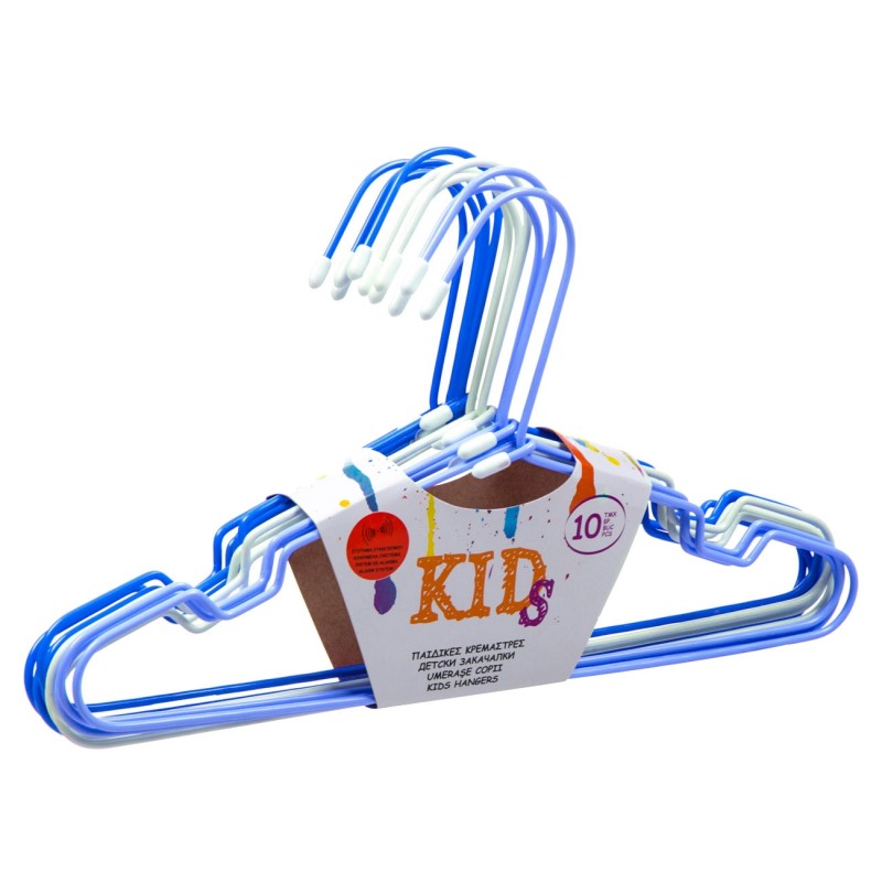 Комплект от 10 броя детски закачалки, изработени от високачествена метална сплав в син и бял цвят със специални защитни тапи на краищата.
