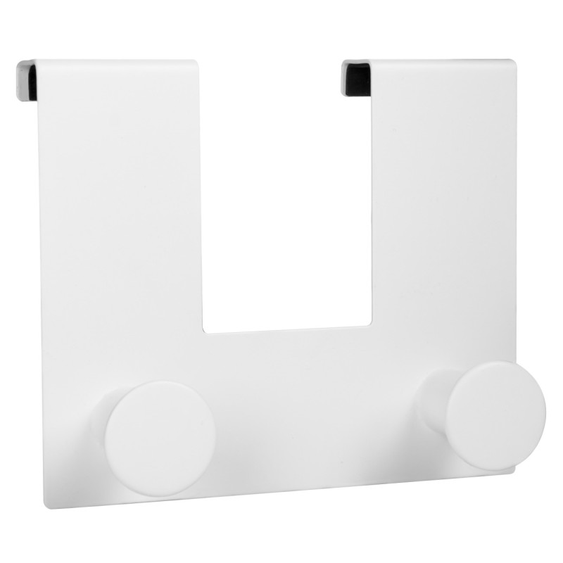 Универсална закачалка за врата, изработена от неръждаема стомана в бял цвят с 2 кръгли куки за закачане на дрехи, чанти и други.