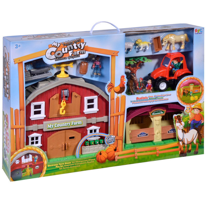 Голям детски комплект включващ електронна ферма с конюшни, трактор, фигурки, животни и аксесоари, изработени от качествена и здрава пластмаса в ярки цветове.