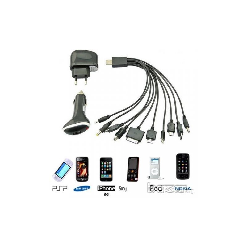 • Универсално USB зарядно 10 в 1 за IPhone 4, iPhone 5, и GSM-и с micro USB.