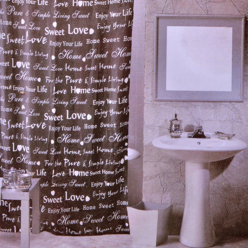 Завеса за баня, изработена от висококачествен полиестер в кафяв цвят с надписи.