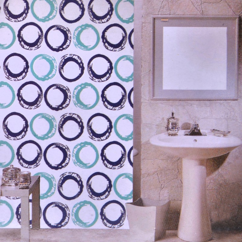 Завеса за баня, изработена от висококачествен полиестер в бял цвят с принт на кръгове в сини нюанси.