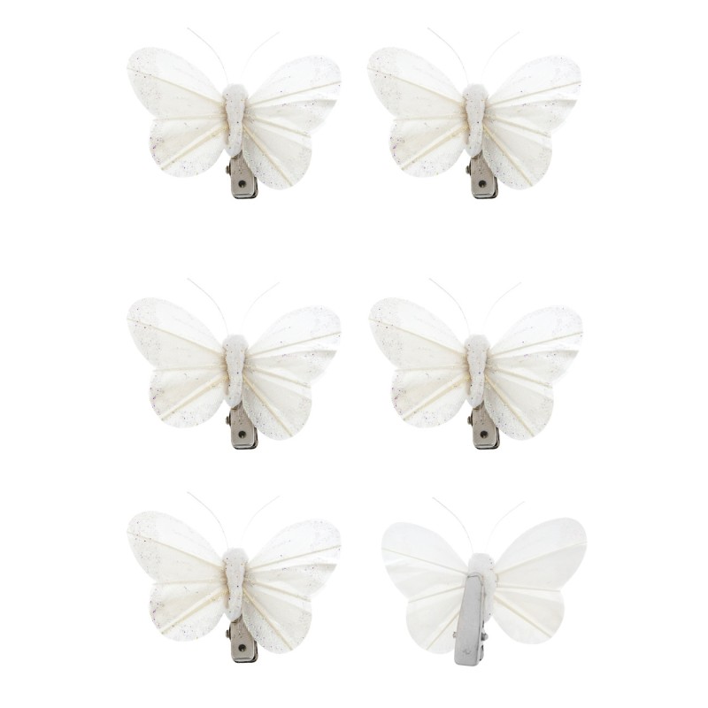 Комплект от 6 броя декоративни аксесоари за пердета и завеси във формата на пеперуди в бял цвят с клипс за лесен монтаж.