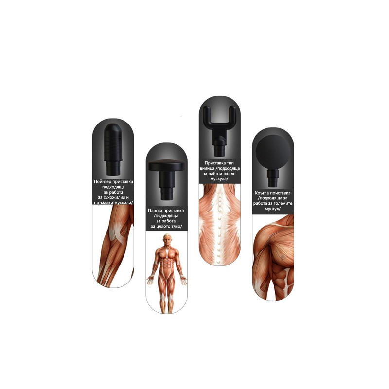 Комплекта е снабден е 4 масажни глави, предназначени за всички мускулни групи.