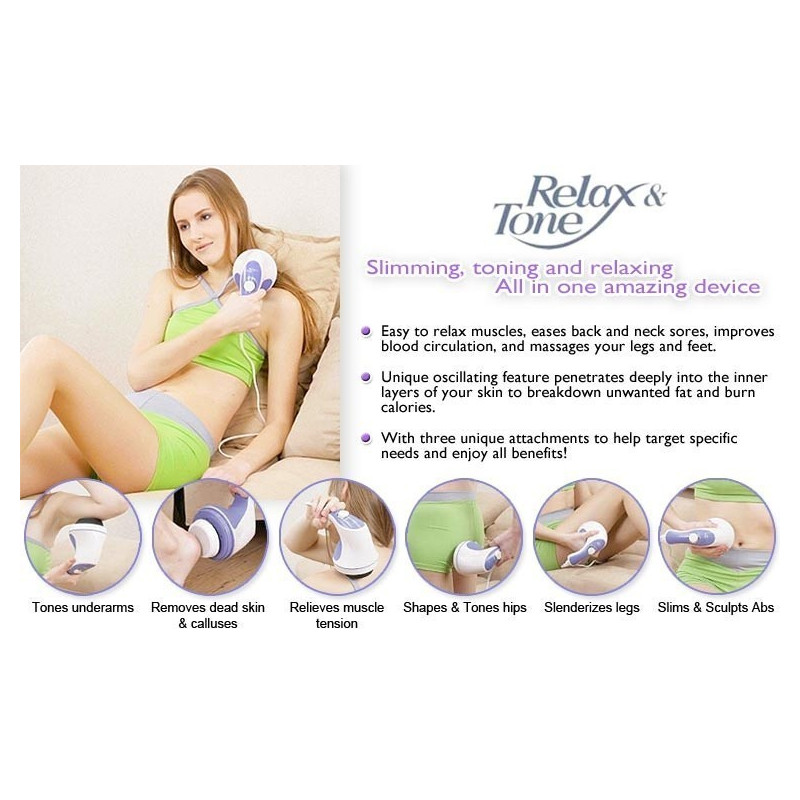 Релаксиращ и антицелулитен масажор Relax & Spin Tone - вашият надежден помощник в постигането на удивителна визия! Изгорете бързо и лесно излишните калории, премахнете неприятния целулит и бъдете във форма, благодарение на един уред - Relax & Spin Tone! Само с посветени 10 минути на ден, този масажор премахва излишните килограми без изморителни упражнения, като същевременно тонизира мускулите. Така че, дори когато сте заети, можете да се насладите на релаксиращия масаж и да се чувствате великолепно!