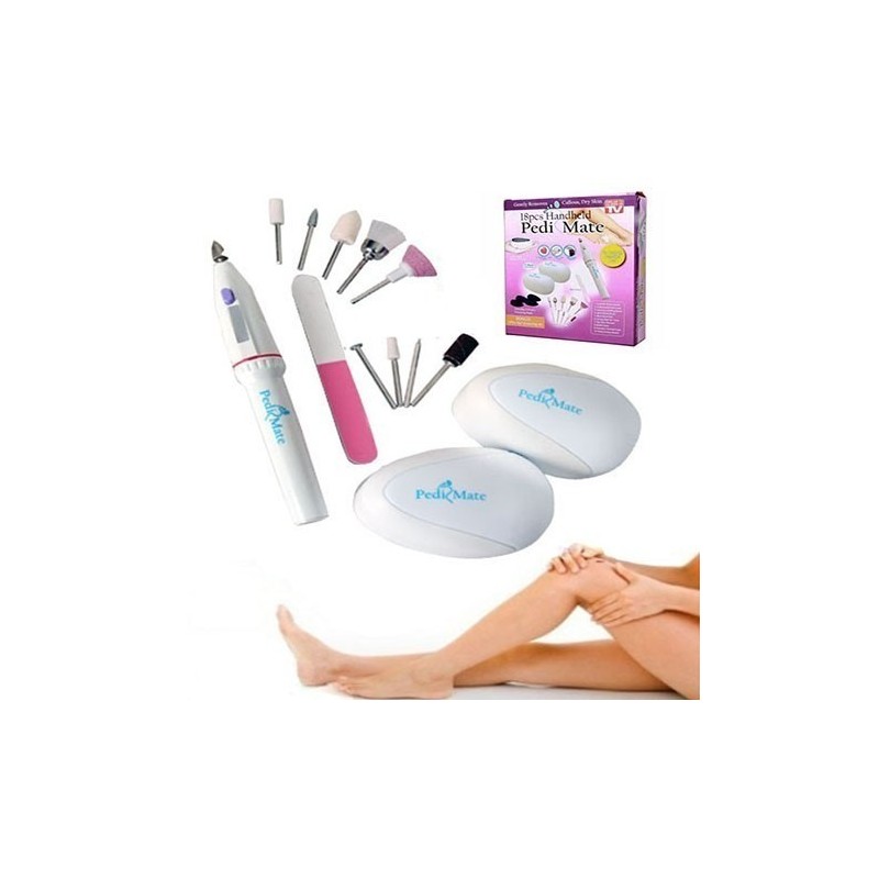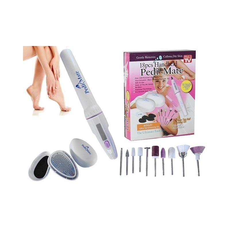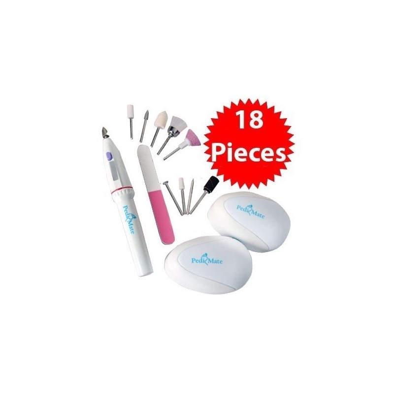 Със своите 18 части, Pedi Mate е идеалният комплект за грижа за краката и ръцете. Безжична и с функциониране на две батерии тип АА, тази система предлага гладка и нежна кожа на петите и професионално оформени нокти. Забравете за скъпите посещения на салони за красота, които не винаги осигуряват желания ефект. С Pedi Mate ще спестите време и средства, а резултатите ще бъдат като от професионалист.