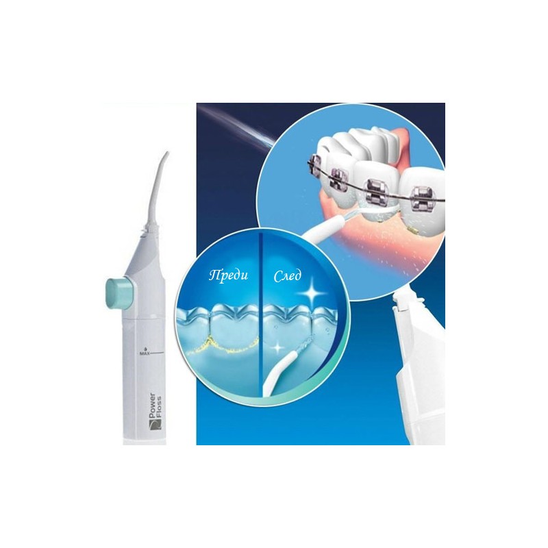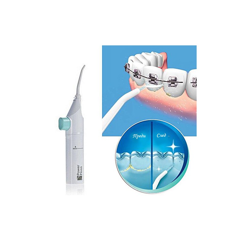 Работи с тънка струя вода, което го прави походящ за почистване на брекети и трудно достъпни места.