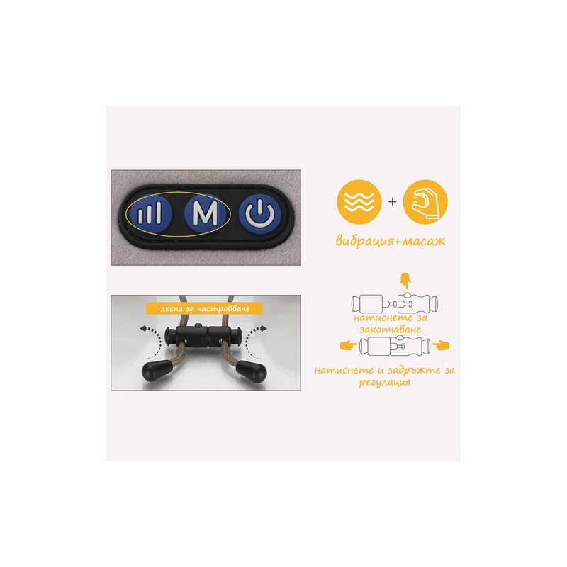 Масажорът има няколко функции – Масаж, вибрация, масаж и вибрация, масаж, вибрация и подгрев.
