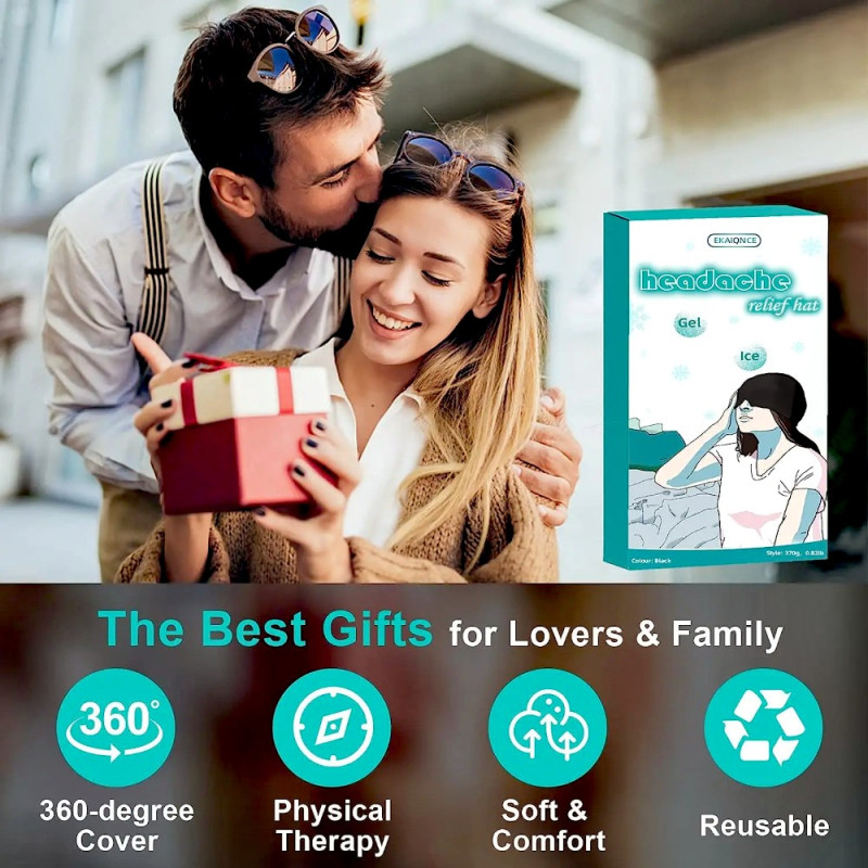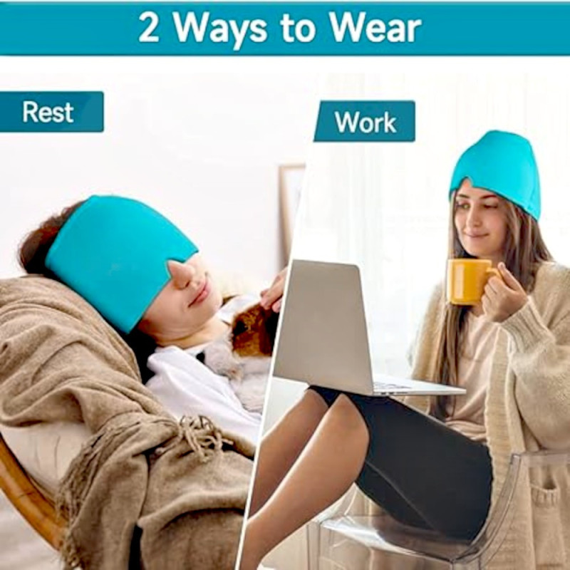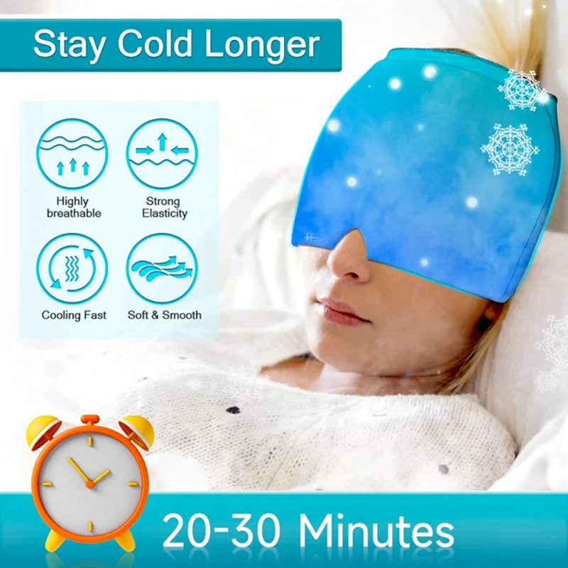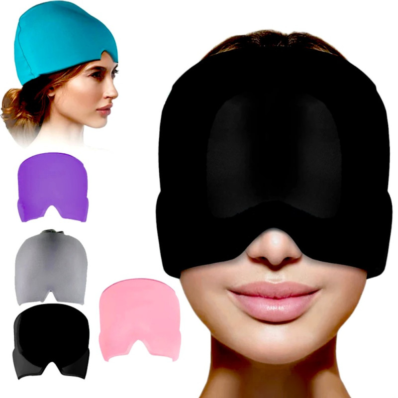 Охлаждащите гел маски при мигрена с персонализирана формула могат да се замразяват за студена терапия или да се загреят в микровълнова за топлинна терапия. Гореща терапия за тензионно главоболие и студена терапия за намаляване на главоболие, подпухнали очи, главоболие и стрес.
