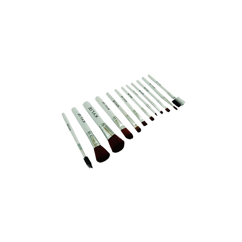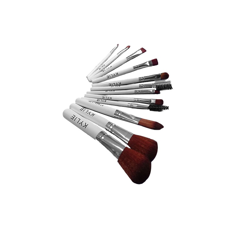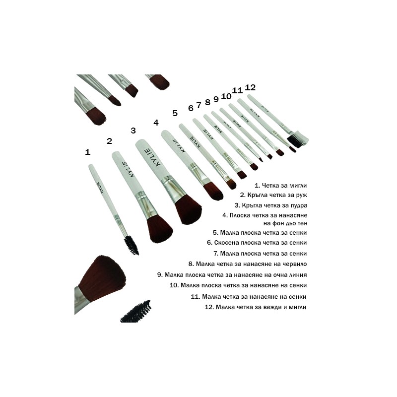 Разполагате с 12 на брой четки: четка за мигли, кръгла четка за руж, кръгла четка за пудра, плоска четка за нанасянена фон дьо тен, малка плоска четка за сенки, скосена плоска четка за сенки, малка плоска четка за сенки, малка четка за нанасяне на червило, малка плоска четка за нанасяне на очна линия, малка плоска четка за нанасяне на сенки, малка четка за нанасяне на сенки, малка четка за вежди и мигли.