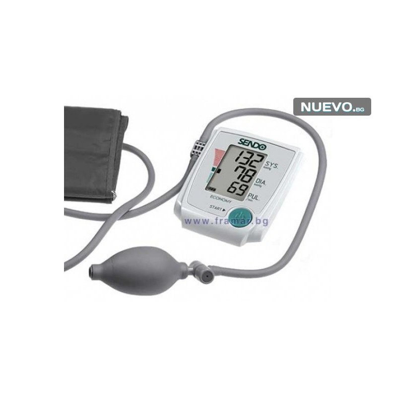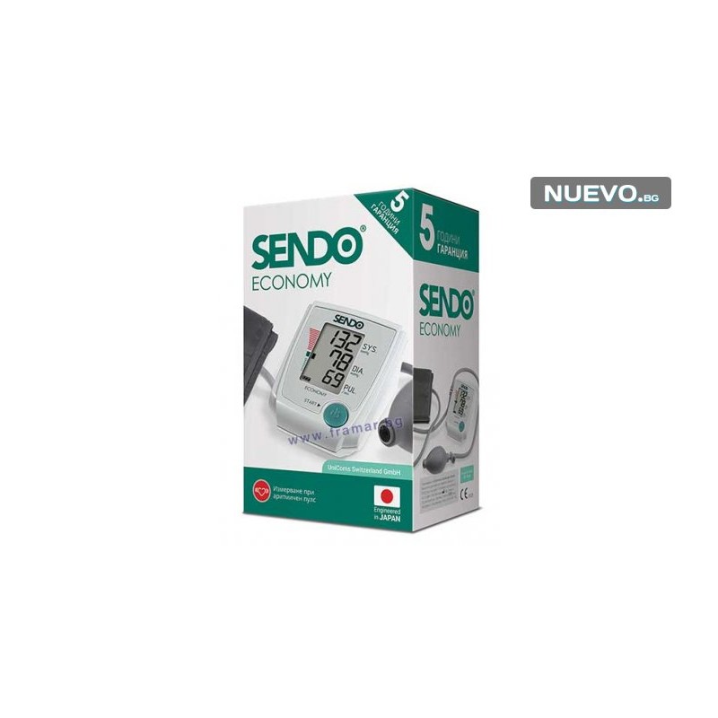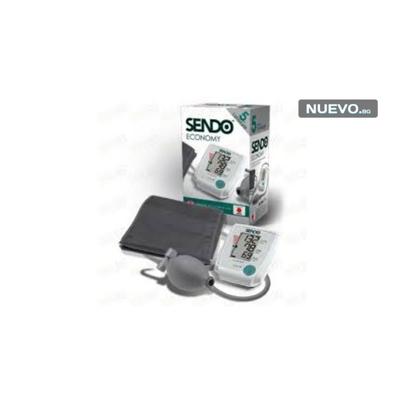Sendo Economy е полуавтоматичен апарат за измерване на кръвно налягане с маншет за поставяне над лакътя. Висококачествен и лесен за употреба апарат за кръвно, разработен и патентован от водещия японски производител на медицински уреди Sendo. Сендо Економи е окомплектован с удобен, стандартен маншет за измерване на кръвно над лакътя, подходящ за измерване на ръка с обиколка на бицепса в отпуснато състояние до 32 см (в случай, че имате нужда от по-голям маншет.